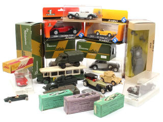 états de 'A' à 'F' - miniatures reproduisant notamment les modèles : FERRARI, MERCEDES, ROLLS ROYCE, RENAULT & PANHARD - quelques manques & parties cassées - les boîtes sont en état de 'b' à 'd' avec annotations