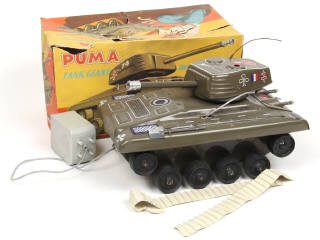 longueur 39 cm - moteur à piles (non testé) - avec mécanisme de pierre à briquet (a revoir) & canon permettant de tirer des billes - chenilles cassées - boîtier à piles incomplet