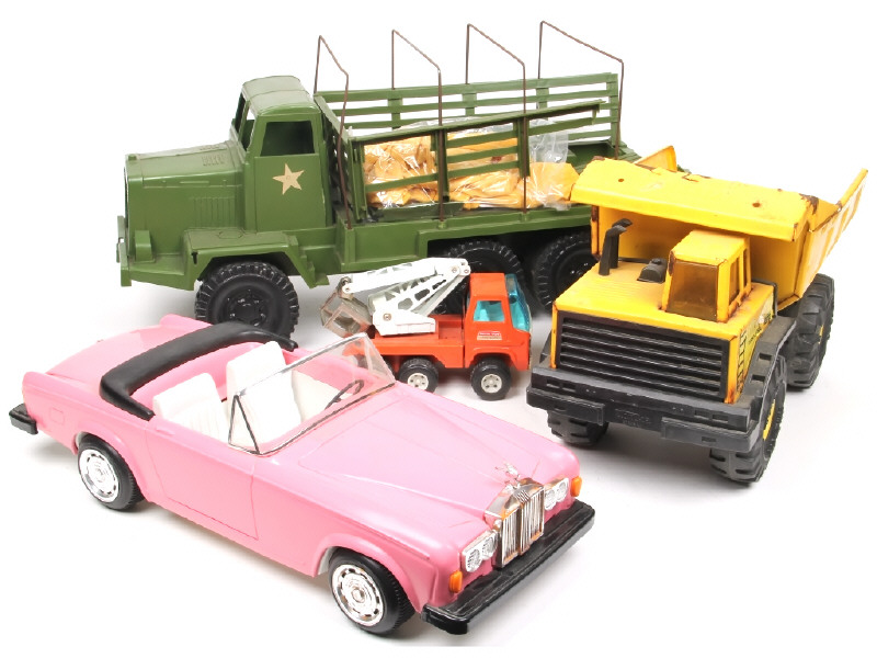 états de 'A' à 'D' - très grande échelle - comprend : camion-benne de chantier TONKA (importantes traces d'oxydation), ROLLS ROYCE de marque ZIMA (HONG KONG), camion grue RICO & camion militaire en plastique - possibilité de petits manques & parties cassées