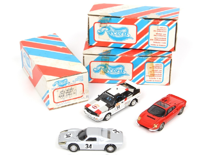 comprend : AUDI QUATTRO, FERRARI 365P & PORSCHE 904 - comprend les marques RECORD (2 exemplaires) & CONRAD (boite non conforme) - possibilité de petits manques