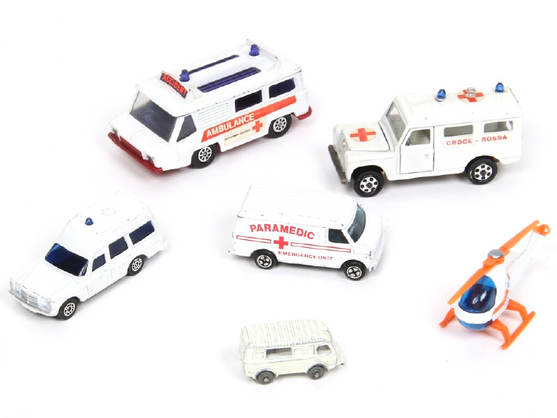 miniatures reproduisant les modèles : hélicoptère, LAND ROVER croix rouge, MOTORWAY AMBULANCE, FORD PARAMEDIC, RENAULT 1000 KG & MERCEDES 2200 - on y retrouve notamment les marque : MEBETOYS, CORGI JUNIORS & CIJ