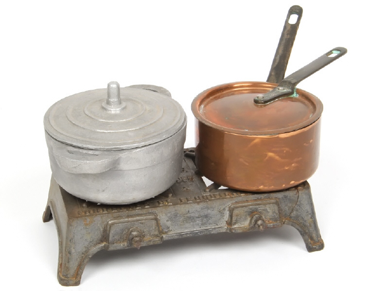 comprend : gazinière de table (20 cm de long, marquée 'CONGRES DU GAZ 1912, S.F AUER, FONDERIES DE FEUQUIERES (SONNE)', petite fissure dans un angle, légères traces d'oxydation), une casserole en cuivre avec son couvercle & une marmite