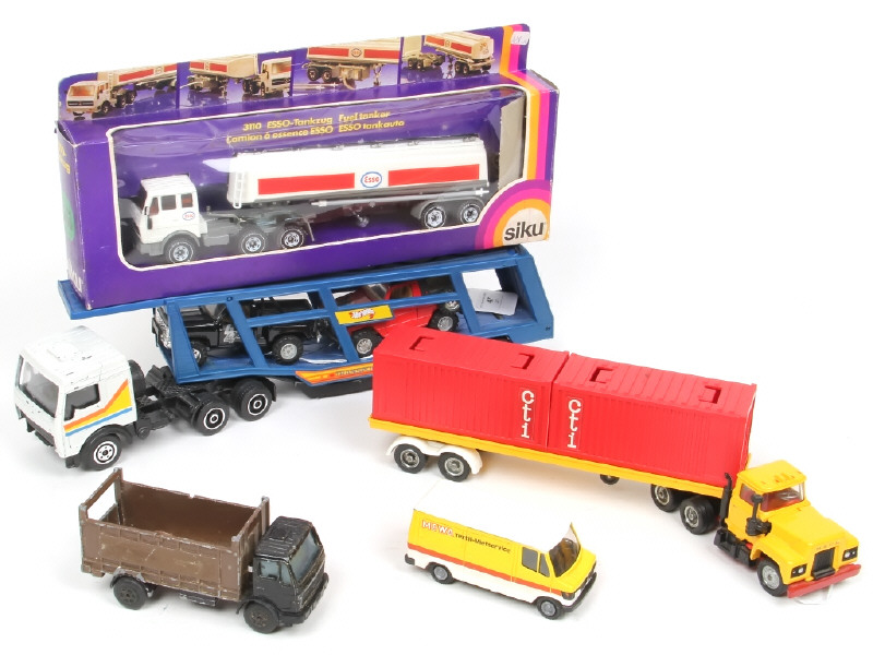 états de 'A' à 'D' - un modèle en état 'R' & un autre en boite (état 'c') - miniatures reproduisant les modèles : MERCEDES (4 exemplaires) & MACK - on y retrouve les marques : MAJORETTE, CONRAD, SIKU, HOTWHEELS & CORGI - manques & parties cassées