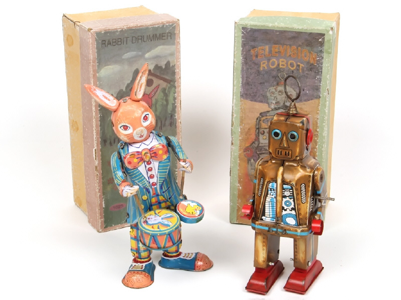 comprend : lapin & robot - avec moteurs à clé (fonctionnent) - reproductions de jouets japonnais YONEZAWA - frottements plus ou moins importants par endroits