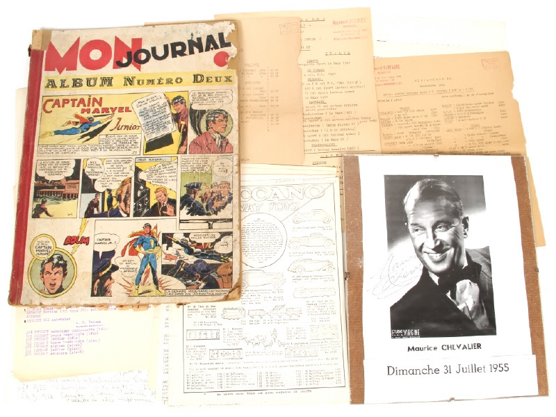 états de 'b' à 'd' - comprend : autographe de MAURICE CHEVALIER sous cadre, documents techniques originaux et reproductions des marques DINKY TOYS, SOLIDO & RD MARMANDE & ALBUM NUMERO 2 MON JOURNAL du 14 novembre 1946