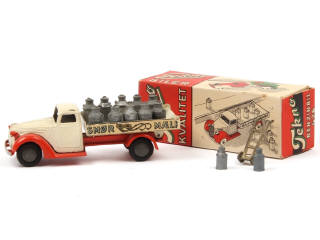 avec 12 bidons (ternis) dont 2 de taille différente & un diable - légers manques sur les décalques - carrosserie encrassée - peinture écaillée sur la cabine - pneus séchés - quelques retouches d'usine sous le plancher - une étiquette de détaillant collée sur un rabat de boite (référence 426)