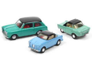 comprend : AUSTIN A40 (manque décalque de plaque minéralogique avant), GOGGOMOBIL (petites taches d'humidité sur la carrosserie) & FRISKYSPORT (état 'C' avec plaques minéralogiques décapées, manque décalques)