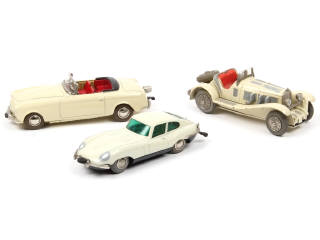 série 'MICRO-RACER' - moteurs à clef (fonctionnent) - comprend : BMW 503 cabriolet, JAGUAR type E (2 pneus séchés & affaissés) & MERCEDES SSK (état 'C', moteur à revoir, avec petits manques)