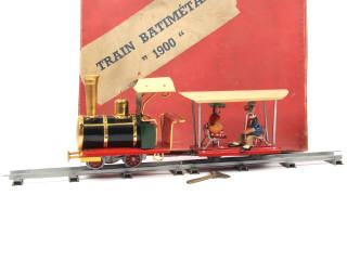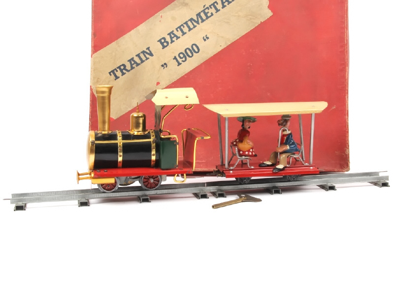 écartement '0' - moteur à clef (fonctionne) - contient : une locomotive à vapeur type 020, 2 voitures de voyageurs ouvertes, 16 rails, 4 personnages en aluminium (quelques manques de peinture plus ou moins importants par endroits) & une clef - coffret plus ou moins taché avec quelques petits manques de papier par endroits