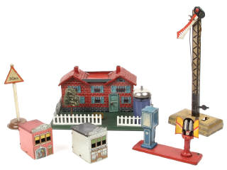 états de 'C' à 'D' - comprend : 3 bâtiments, pompes à essence & signaux - quelques petits manques & parties cassées - petites traces d'oxydation par endroits