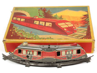 contient : un autorail à 2 éléments (moteur à clef à revoir) & 4 rails courbes (ternis) - quelques petits frottements & traces d'oxydation par endroits - avec cale de boîte