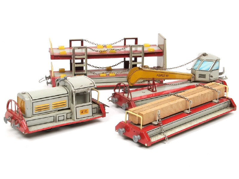 écartement '0' - comprend : une motrice diesel 416 (moteur à clef fonctionne), un wagon plateau porte-planches, porte-voitures (sans chargement, un attelage manquant avec un important manque de peinture sur une échelle) & plateau avec grue - quelques éléments plus ou moins ternis, légèrement déformées avec quelques traces d'oxydation par endroits