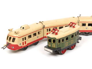 longueur 49 cm - moteur électrique (à revoir) - quelques éléments non d'origine (restaurations) & d'autres manquants - on y joint une motrice électrique 'PO' de la marque en état 'B' (moteur électrique fonctionne, le toit est en état 'C' avec petites déformations & éclats par endroits)