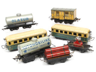 états de 'B' à 'C' - comprend : voiture de voyageurs PULLMAN (2 exemplaires), wagon citerne (2 exemplaires différents), plateau avec bouteilles de gaz, projecteur & fourgon - quelques petites traces d'oxydation par endroits