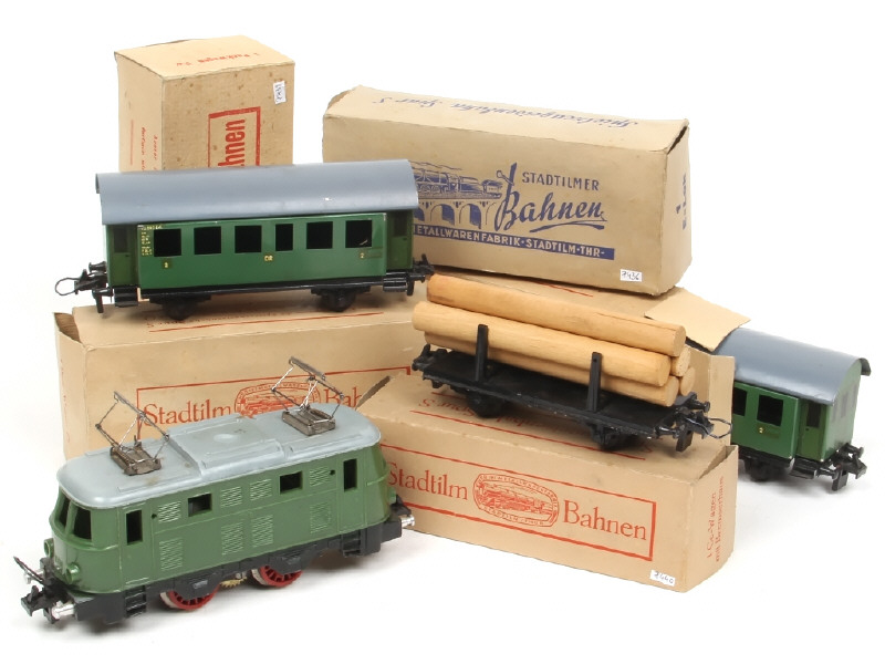 une boite en état 'd' - comprend : motrice électrique E18 (non testé), 2 voitures voyageurs, wagon porte-bois & fourgon postal - quelques frottements & légères traces d'oxydation