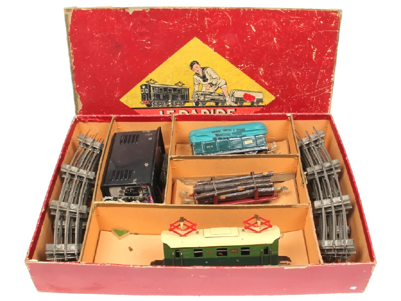 dimensions du coffret : 54 x 38 cm - contient : une motrice électrique 'PO' (non testé), wagon plateau porte-grumes, tombereau bâché 'MARECHAL FRERES', un transformateur & rails (plus ou moins ternies) - quelques petites retouches sur la motrice - manque une fixation d'attelage