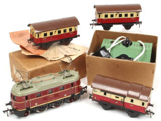 non testé - comprend : motrice électrique 335 (quelques petites retouches & légères traces d'humidité par endroits) 2 voitures-voyageurs & wagon-fourgon à bagages (quelques traces d'oxydation) - on y joint un transformateur TR50 en boite (référence 505/220)