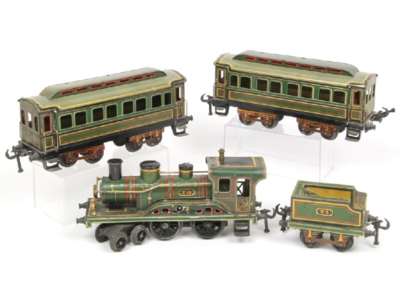 écartement '0' - comprend : locomotive avec tender (moteur à clé, fonctionne) & 2 voitures voyageurs - quelques frottements & légères traces d'oxydation par endroits