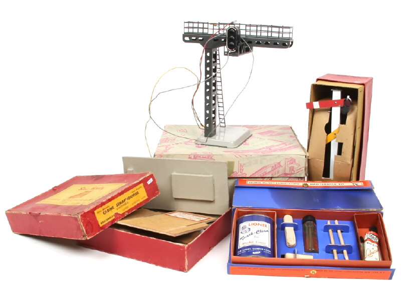 comprend : cabine sémaphorique, un signal automatique sur potence & sémaphore à 2 bras - on y retrouve les marques : HORNBY (FRANCE & GB) & JEP - on y joint un kit de maintenance (référence 927) de la marque LIONEL (quelques manques avec éléments utilisés & séchés)