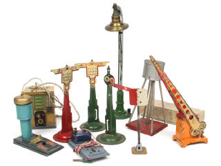 états de 'D' à 'E' - comprend notamment : lampadaires, sonnette, transformateur, réserve à eau & barrière - on y retrouve notamment les marques : JEP (un exemplaire en boite état 'c' ) & P.P - quelques petites retouches & accessoires manquants