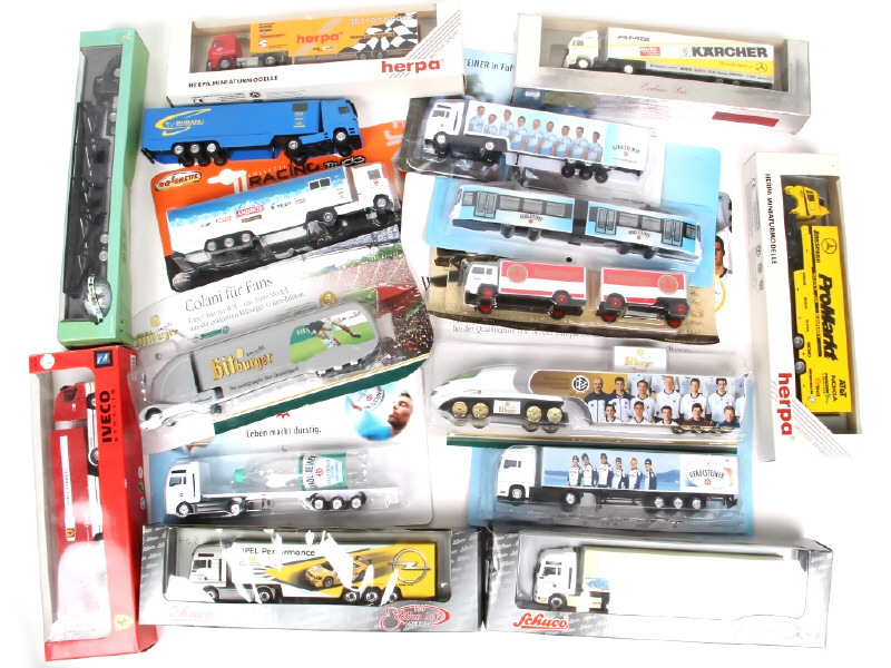 échelle 1/87ème - miniatures reproduisant notamment les modèles : MERCEDES, MAN, IVECO, RENAULT & BERLIET - on y retrouve notamment les marques : MAJORETTE, NOREV, SCHUCO & NEW RAY - possibilités de petits accessoires manquants - les boites sont en état de 'b' à 'c' - un exemplaire sans boite