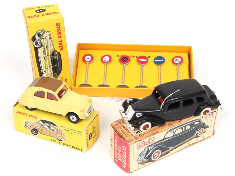 série 'DINKY TOYS' - comprend : BUICK ROADMASTER, CITROËN 2 CV & panneaux de signalisation de VILLE - on y joint une CITROËN TRACTION NOREV (reproduction)