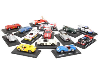 miniatures reproduisant notamment les modèles : PORSCHE, MERCEDES, FERRARI & LOLA - principalement collections presse - sur socles dont certains non conformes - possibilité de petits manques