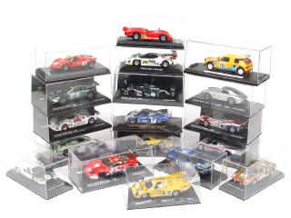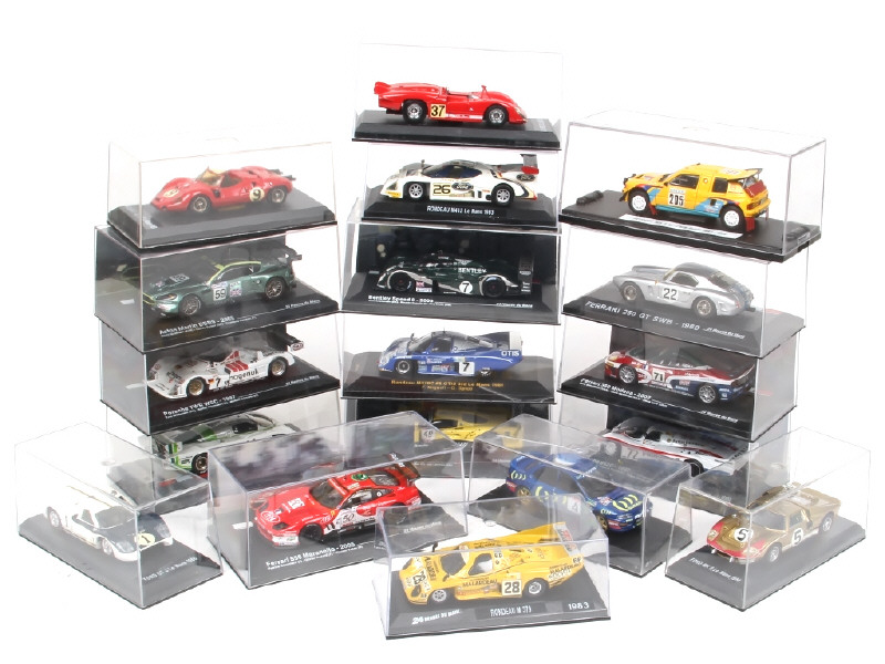 miniatures reproduisant notamment les modèles : PEUGEOT, PORSCHE, FERRARI & BENTLEY - on y retrouve notamment la marque : IXO - certaines en kit montés - quelques boites non conformes - possibilité de petits manques
