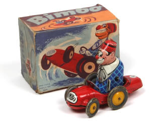 longueur 12 cm - moteur à clef (fonctionne poussivement) - en action, la voiture tourne en rond tandis que le personnage oscille d'avant en arrière & fait se cabrer l'avant du véhicule par son poids - quelques frottement & légères déformations plus ou moins importants par endroits - manque les bras