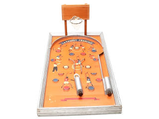 fabrication en bois & métal - dimensions : 57,5 x 31,5 cm - fonctionne comme un jeu de flipper, le hasard décide du moment où vous pourrez shooter ! - quelques rayures & traces de frottement - sans balle