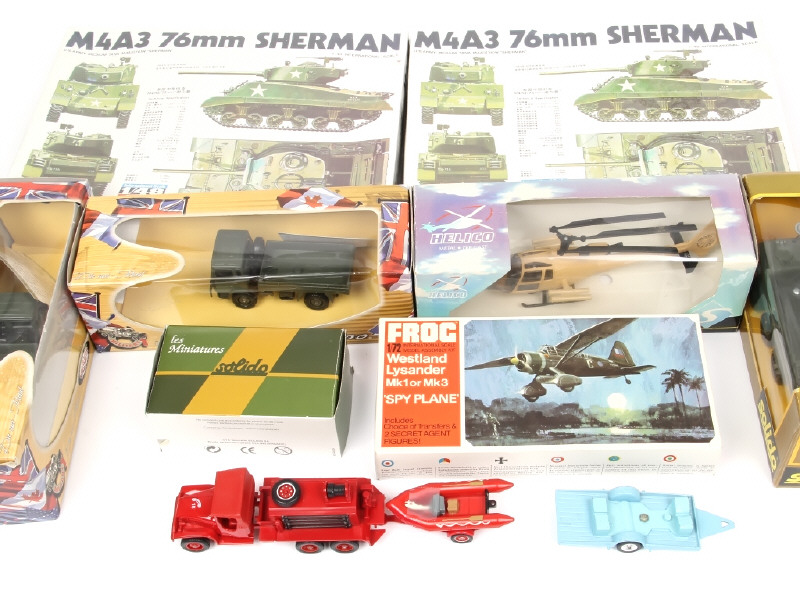 miniatures reproduisant les modèles : RENAULT, GMC, AEROSPATIALE-GAZELLE & ALVIS - 3 exemplaires sans boite dont un retouché & un autre en état 'B' - on y joint 3 maquettes à monter des marques : FROG & FUMAN