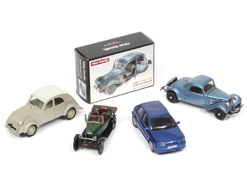 comprend les modèles : 2CV, TRACTION, SAXO & B2 - on y retrouve notamment la marque IDEM - très légères déformations par endroits - on y joint une boîte d'éléments en résine permettant la transformation de divers modèles de marque THE BODI MODELS (semble complet)