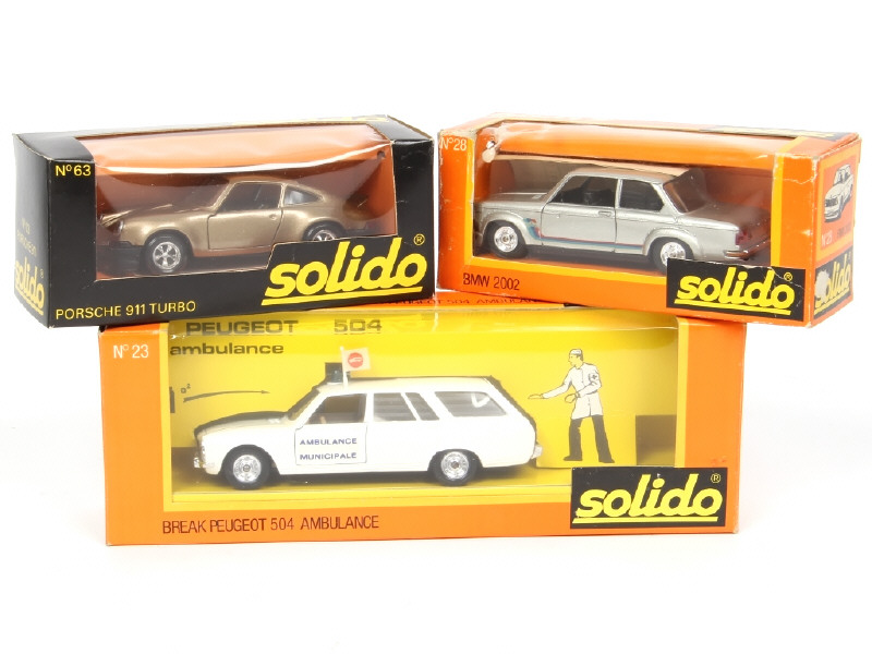 comprend : PORSCHE CARRERA RS (boite de la référence 63 de la PORSCHE 911 TURBO), BMW 2002 (boite en état 'c' avec traces de colle) & PEUGEOT 504 break 'AMBULANCE'