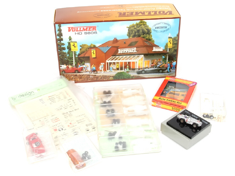 échelle 1/87ème - comprend notamment les modèles : MERCEDES (en coffret édition limitée à 1000 exemplaires) FERRARI, LOTUS, PORSCHE, Mc Laren & WILLIAMS - on y retrouve notamment les marques : BUSH, BS DESIGN & VOLLMER - 9 exemplaires en kit (à monter) - on y joint une maquette de garage 'FERRARI' (avec voiture FERRARI TESTAROSSA), planches d'autocollants & un set d'éclairage