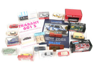 échelle 1/87ème - miniatures reproduisant notamment les modèles :SEAT, VOLKSWAGEN, AUDI, TRABAN & MERCEDES - on y retrouve notamment les marques : RIETZE, BREKINA, BERTREN & IMU