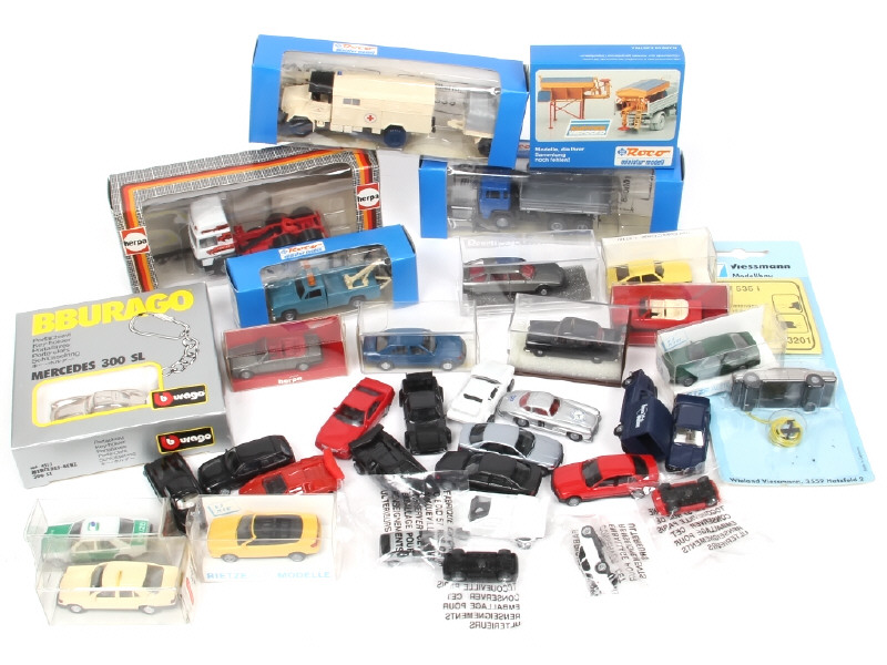 différentes petites échelles - comprend notamment les modèles : MERCEDES, DODGE, OPEL, CITROEN, LAMBORGHINI & BMW - on y retrouve notamment les marques : ROCO, BREKINA, BBURAGO, PRALINE & HERPA - 18 exemplaires sans boite (dont 4 sous sachet jamais ouvert)