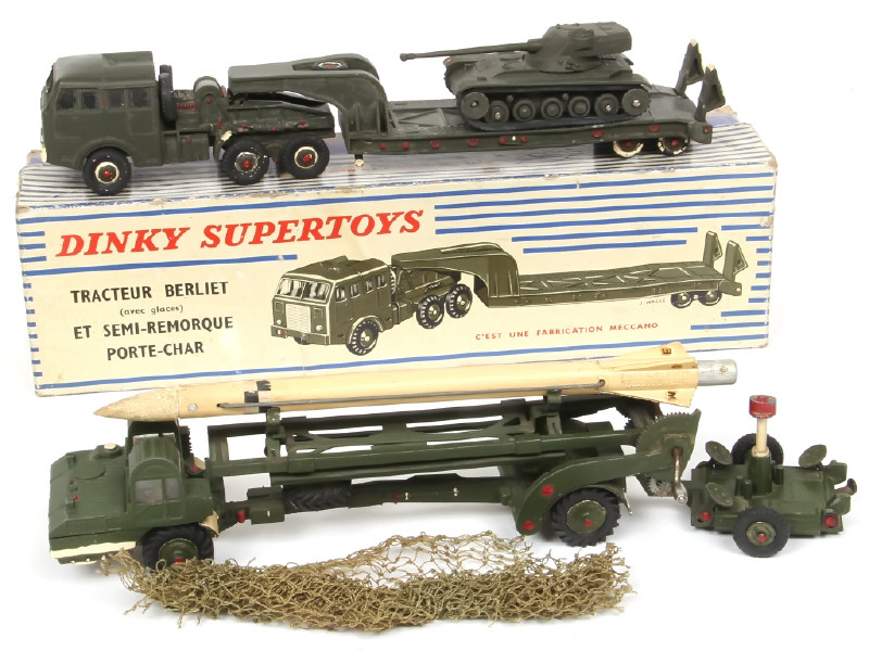 états de 'C' à 'D' - comprend : BERLIET semi-remorque plateau transport de char (en boîte tachée état 'c') & CORPORAL - on y joint un AMX 13 - détails de peinture ajoutés, carrosseries encrassées avec quelques manques