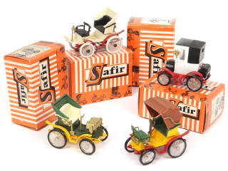 états de 'A' à 'C' - comprend : DECAUVILLE vis à vis 1901, PEUGEOT VICTORIA 1898, 1896 & RENAULT coupé 1900 - quelques petits accessoires manquants - boîte plus ou moins tachées