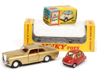 on y joint un HEINKEL (référence 233) de la marque CORGI TOYS en état 'C'-'c' (carrosserie légèrement décolorée avec traces de rubans adhésifs sur la boîte)