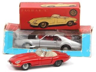 comprend : JAGUAR TYPE E (en état 'B.b' - plancher avec éclats plus ou moins importants - boite avec un coin enfoncé) & OLDSMOBILE TORONADO (en état 'A.c') - on y retrouve les marques TEKNO & KIRK