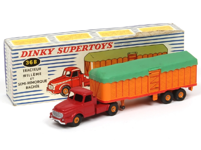 DINKY TOYS (FRANCE) 36B WILLEME Semi-remorque bâché (version avec jantes concaves) rouge & orange, bâche verte