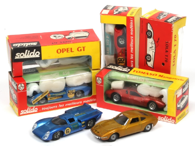comprend notamment : DE TOMASO MANGOUSTE, FERRARI 312P, OPEL GT, MATRA SIMCA 650 & LOLA T70 - légers accrocs sur certaines boites (dont une avec blister déchiré)