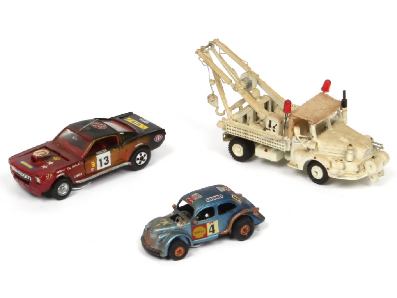 transformations sur base DINKY TOYS - comprend : tracteur UNIC (quelques petits éclats par endroits), FORD MUSTANG (accessoires déformés & cassés) & PANHARD DYNA de compétition (sur base C.I.J)