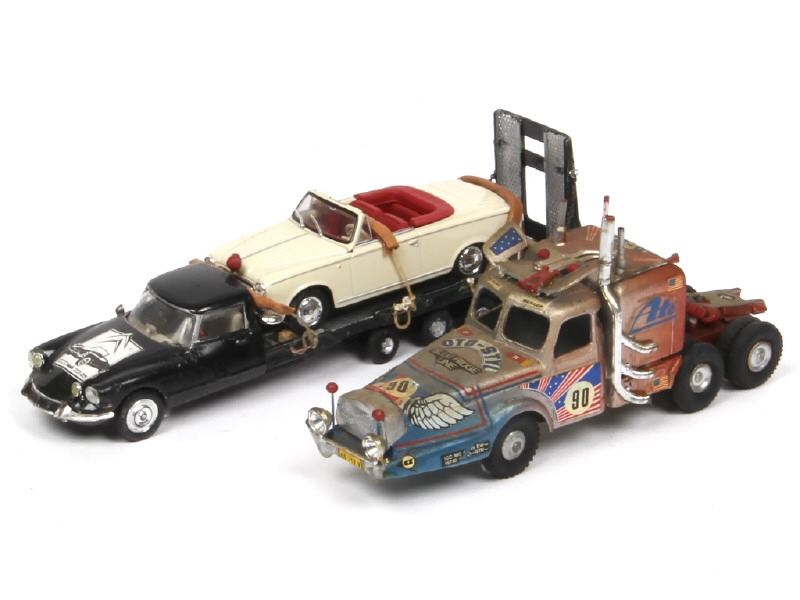 comprend : WILLEME tracteur routier (sur base DINKY TOYS FRANCE), CITROEN DS plateau & PEUGEOT 403 (transformations sur base kiosque - petits accessoires manquants & cassés)