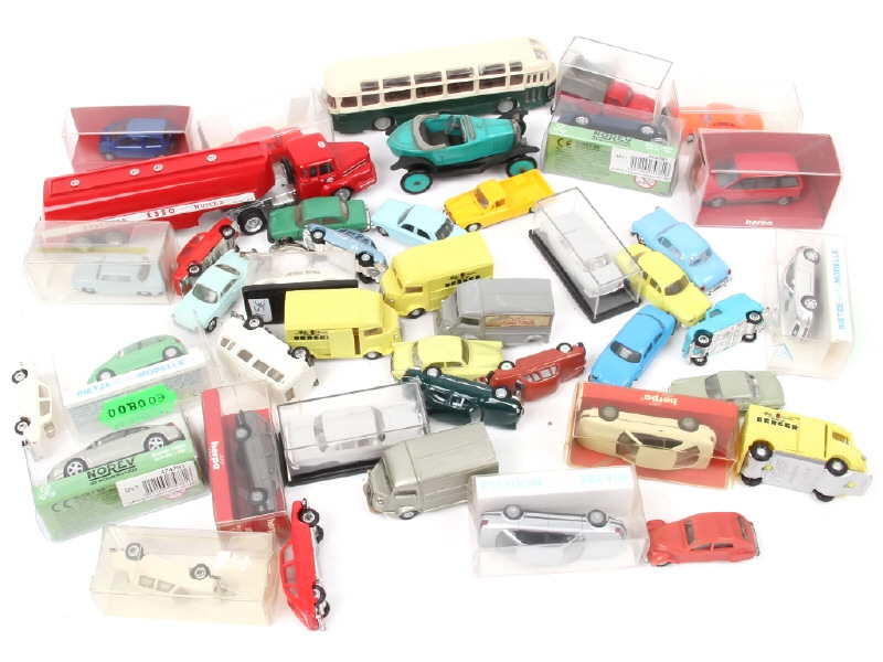 échelle HO - états de 'A+' à 'D' - miniatures reproduisant notamment les modèles : MERCEDES, BMW, RENAULT, PEUGEOT, SIMCA, CITROEN & SAVIEM - on y retrouve notamment les marques : NOREV, RIETZE & HERPA - un modèle porte-clefs - possibilités de petits manques & parties cassées - 17 exemplaires en boite