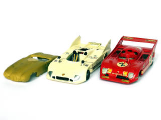 miniatures reproduisant les modèles : ALFA ROMEO 33 TT 12 & PORSCHE 908/04 1975 (manque un morceau d'aileron) - on y joint une caisse en résine de GORDINI