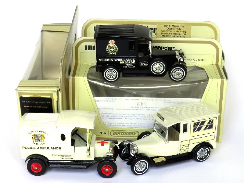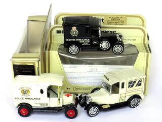 miniatures reproduisant les modèles : FORD T 'POLICE AMBULANCE NORTHAMPTON', TALBOT 'AMBULANCE PORT OF LONDON' & TALBOT 'AMBULANCE ST JOHN BRIGADE' - séries limitées à 1000 exemplaires chaque par CREEKS, avec certificats