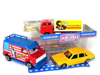miniatures reproduisant les modèles : TALBOT SOLARA, VOLVO F89 fourgon 'LA PIE QUI CHANTE' & van US 'AMERICA'
