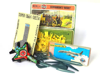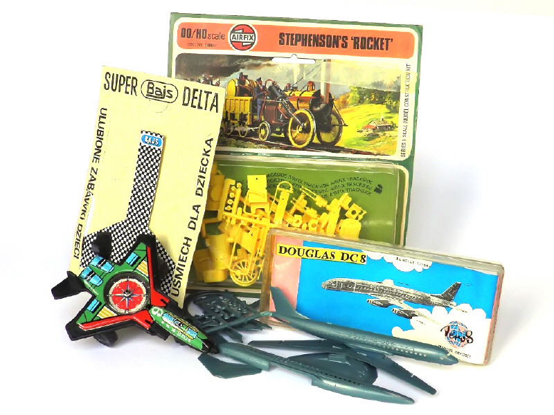 réalisations en plastique - comprend : avion DOUGLAS DC8 (en kit), avion SUPER DELTA (en tôle lithographiée & plastique) & train STEPHENSON'S ROCKET (en kit) - on y retrouve les marques : AEROS (France), BAJS (Tchecoslovaquie) & AIRFIX