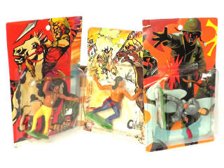 hauteur 7 cm - réalisations en plastique - comprend : 2 indiens (troncs pivotants) & un soldat (tête pivotante)